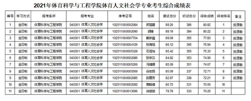 2021年Bevictor韦德体育人文社会学专业考生综合成绩表公布