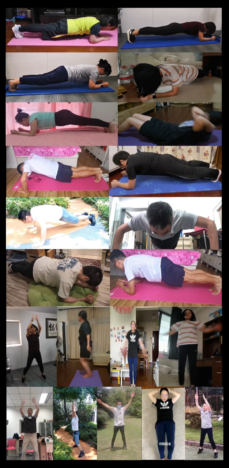 活动设置了平板支撑、俯卧撑、开合跳、仰卧起坐等项目的比拼。此次活动得到公司教职工的积极响应,共收到20余条视频。公司党委副书记(主持工作)徐文方、公司党委副书记吴婷作为运动员参与比拼,公司经理王跃,副经理韩骏、叶心明作为评委参与此次活动。