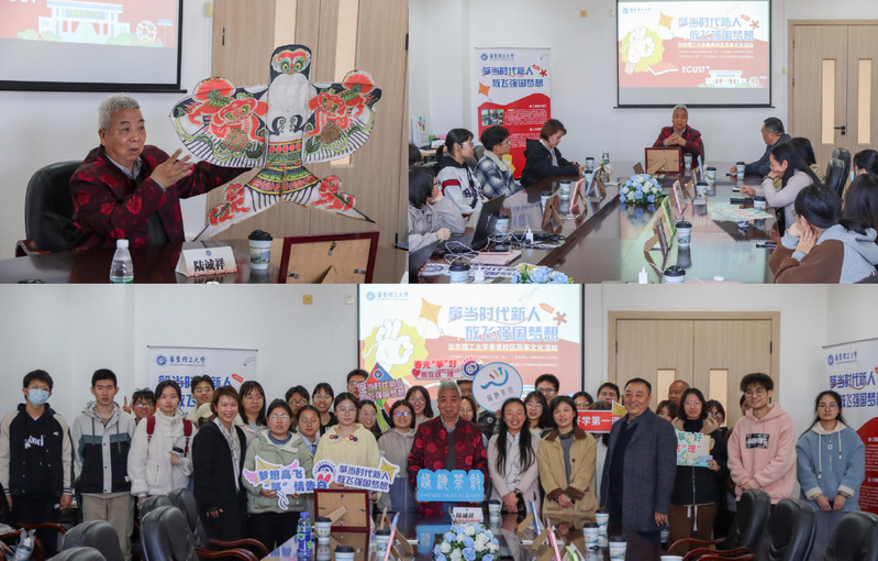 活动第一环节,邀请沪上知名手艺人、杨浦区非物质文化遗产风筝继承人陆诚祥老师做客通海茶叙,为师生讲解风筝非遗文化。通过风筝类型与历史文化、风筝制作技艺、放飞技巧等内容的讲解,结合现场形形色色的风筝实物,陆老师向同学们介绍风筝这一凝聚匠心的非物质文化遗产,带领大家感受非遗文化的魅力。