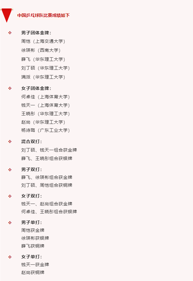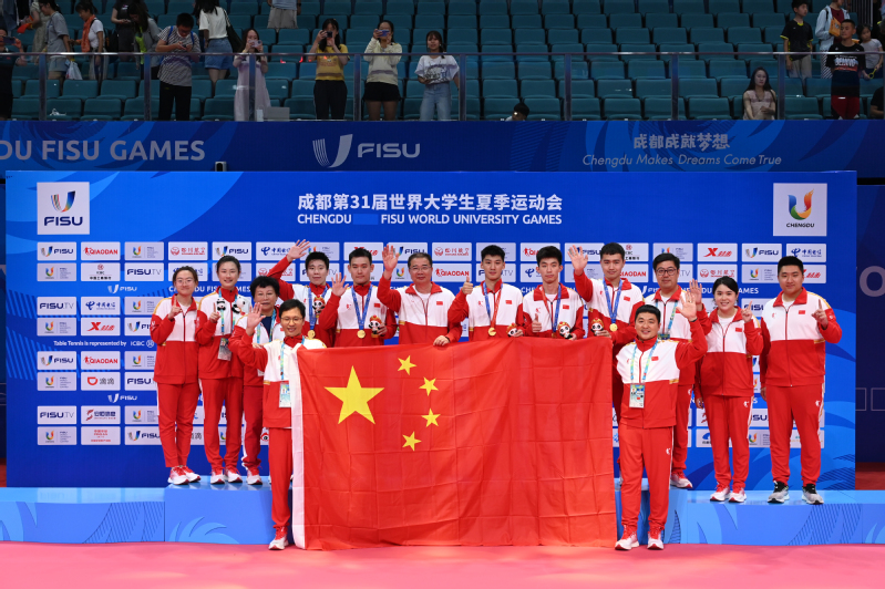 中国队在决赛中的对手是中国台北队,周恺、徐瑛彬、薛飞各自延续了半决赛的火热状态,直落三局战胜对手,帮助中国队成功夺得大运会乒乓球男团冠军!
