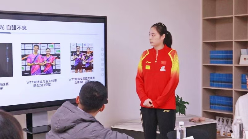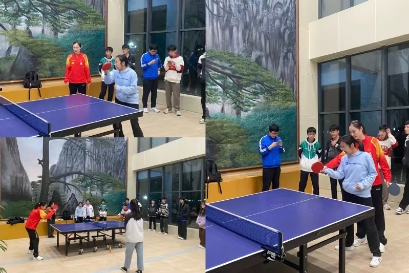 王晓彤深知体育对于个人全面发展的深远影响,它不仅能够增强体魄,更能激发精神活力。在校园里,王晓彤积极投身于乒乓球的宣传与推广活动中,无论是亲自示范技术动作,还是耐心指导初学者,她都以以满腔的热情和专业的指导,传递着乒乓球运动的精髓和乐趣。她向同学们分享了从省队到国青队再到国家队,从小球员到成都大运会冠军再到国家队队员,一路成长,不断突破的历程。她以乒乓球训练的心得,以及大运会冠军成长之路向大家诠释“有一种坚持叫百炼成钢”,不断传递着体育的力量和魅力。