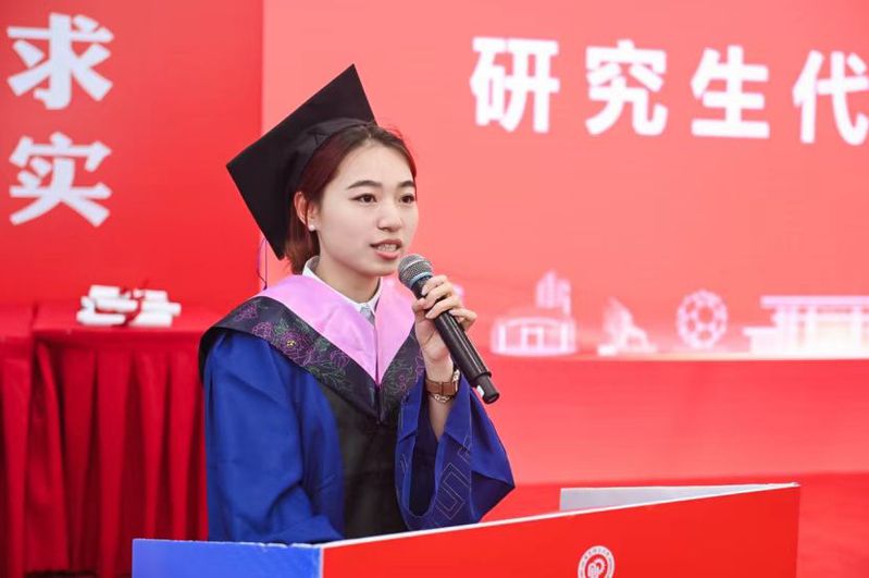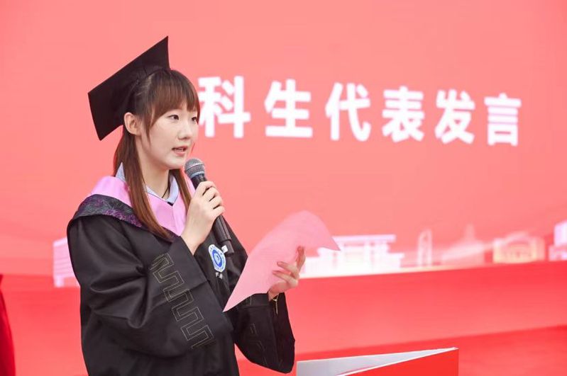 校优秀毕业生、体研2101班的陶雅洁在发言中讲述了精益求精的科研探索对自己心境的磨砺和对认知的突破,同时感谢母校培养了同学们坚守初心的执着和心怀家国的担当,并表示将会在这份责任的激励下脚踏实地、砥砺前行,以青春之名,赴时代之约。