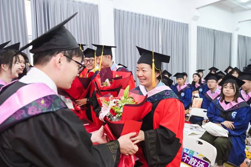 典礼上,毕业生代表向教师献上鲜花表达感恩之心,全体毕业生在主会场的带领下集体宣读毕业誓词《青春有为》,将毕业典礼推向高潮。在典礼结束之际,全体毕业生共同献唱歌曲《再见》,用歌声把校园时光凝结于此,也用歌声表达着对未来最美好的祝福。