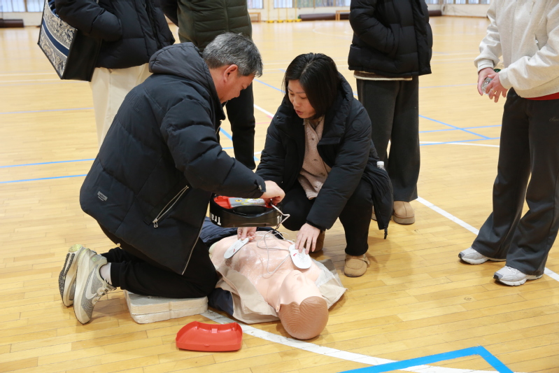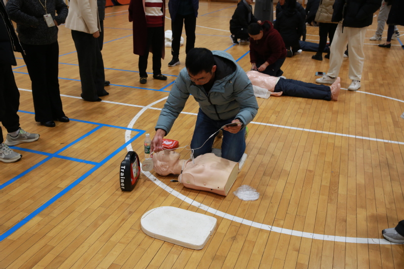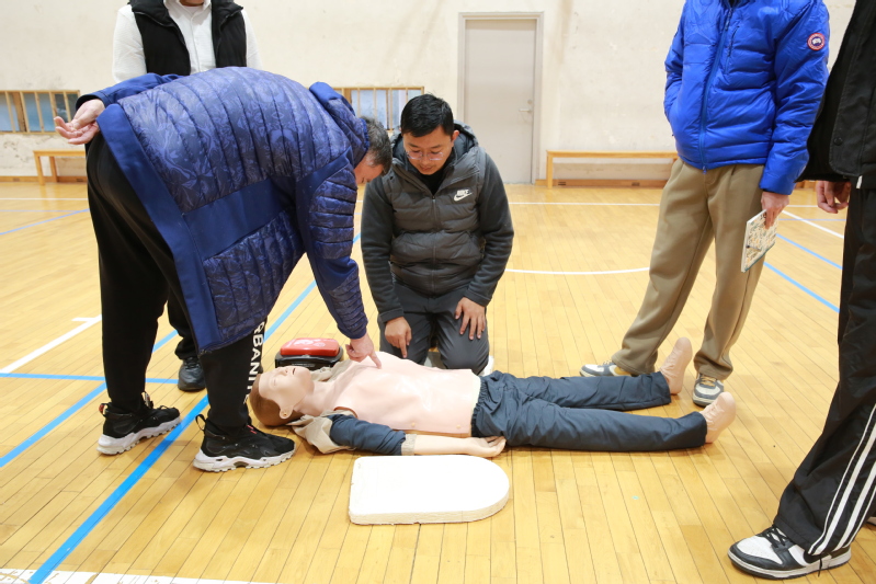 为确保每位教职工都能充分掌握急救技能,讲座和视频讲解结束后,进一步开展了实操演练。教职工分为4个小组,每个小组都配备了具备游泳救生资格并熟练掌握心肺复苏及AED使用技能的指导教师协助进行指导。教职工们积极参与实操演练,按照所学知识和技能,在模拟人身上认真地进行心肺复苏操作。从双手的正确摆放位置到按压的节奏和幅度,每一个动作都力求标准规范。在AED设备的操作练习中,他们也严格按照步骤进行模拟操作,展现出极高的学习热情和救护意识。指导教师在一旁仔细观察,及时纠正教职工们在操作过程中出现的小错误,并给予积极的鼓励和指导。