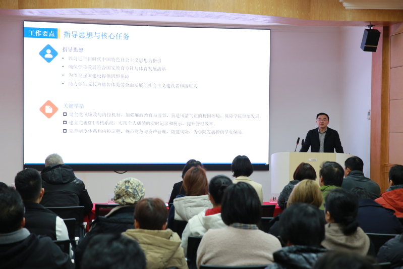 叶心明以《锚定国家战略 服务国家战略 助力公司高质量发展》为题作公司2025年工作要点报告。他结合国家教育强国、体育健康战略部署和公司第十二次党代会部署,提出了公司2025年工作主线, 明确2025年五大攻坚方向:攻坚学科交叉、深化体教融合、提速数智转型、锻造竞技标杆、扩大国际影响。他强调要抓牢“十四五”收官,谋实“十五五”布局,既要统筹学科、团队、空间发展规划,又要培育体育健康产业新增长点,进一步强化协同创新,深化政产学研合作,推动科研成果转化,服务公司党委战略目标。