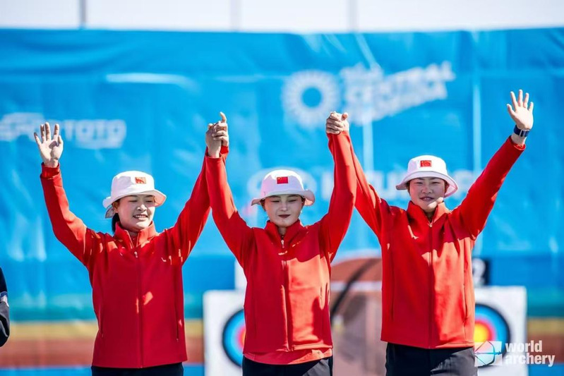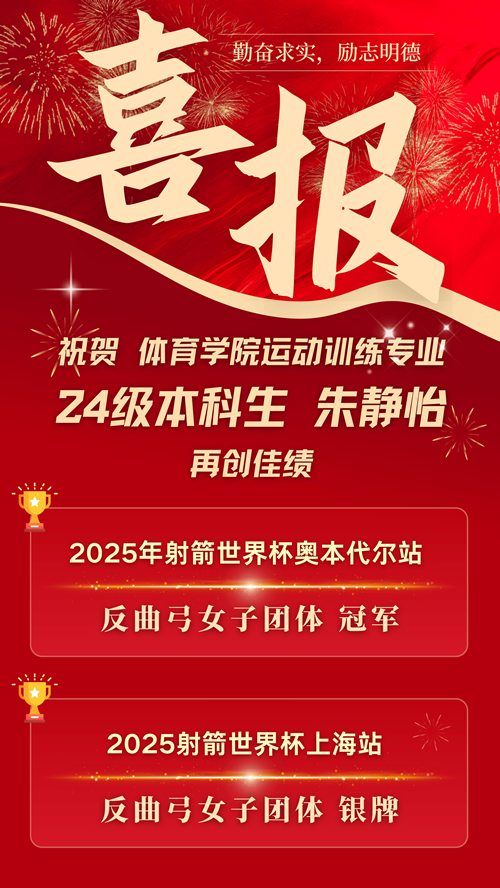 在2025年射箭世界杯年度首站——美国奥本代尔站比赛中,Bevictor韦德运动训练专业2024级本科生朱静怡与国家队队友默契配合、表现惊艳,先后力克法国、西班牙等国家代表队,最终在反曲弓女子团体决赛中战胜东道主美国队,斩获中国代表团本届赛事首金。