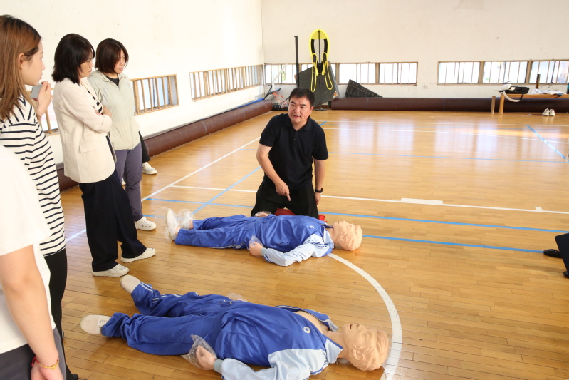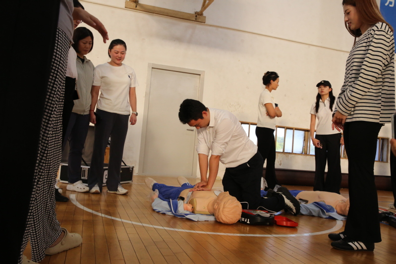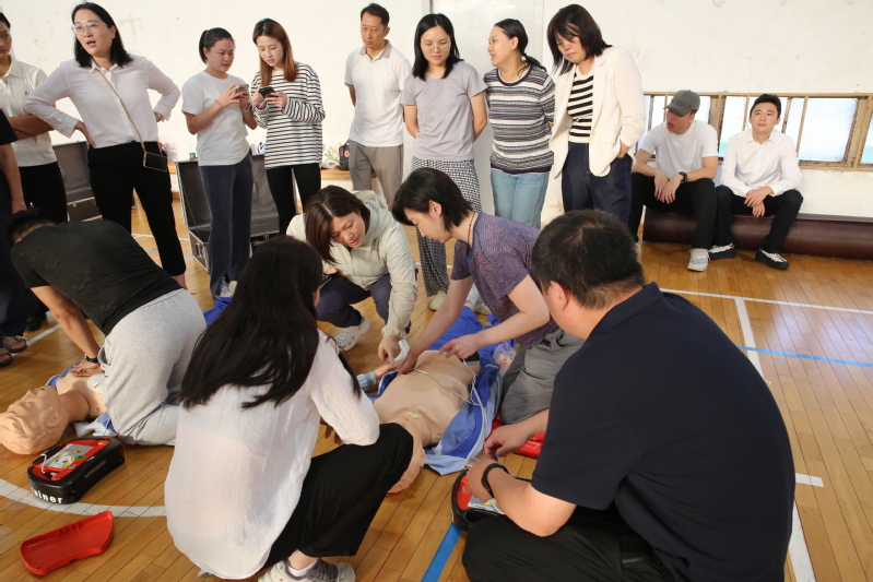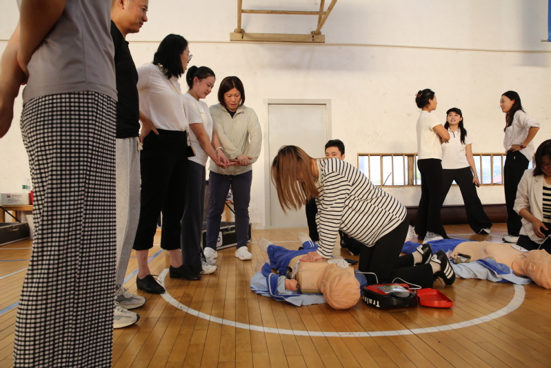 在实操环节,参训教职工于体育馆内重点进行心肺复苏、AED操作演练。陆刚医生现场示范并巡回指导,及时纠正操作误区,确保动作规范、流程标准。大家积极投入、认真练习,展现出高度的学习主动性和责任意识。