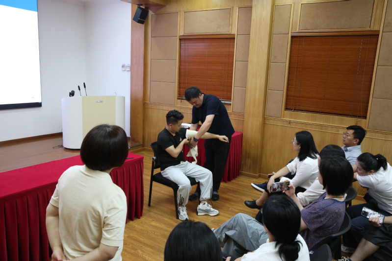 培训分为理论讲授与实操演练两部分。陆刚医生围绕应急救护的核心原则与操作体系,系统讲解了现场评估、伤情判断、急救呼叫及基础救护技能等内容,重点介绍了心肺复苏(CPR)和自动体外除颤器(AED)的使用要点,并专门讲解示范针对头部、手臂等不同部位创伤的三角巾、绷带等包扎技术,为教职工奠定了扎实的理论基础。